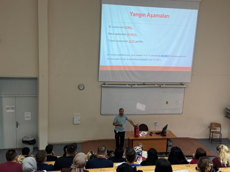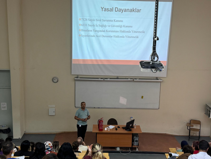 Üniversitemiz Hastanesi Sivil Savunma Amiri Sağlık Memuru Özcan İLGÜN tarafından verilen eğitimde yasal dayanaklar, afet ve acil durum tanımları, bütünleşik afet yönetimi döngüsü, deprem tehlikesini belirleyen faktörlerden deprem anında ve o sonrasında yapılması gerekenler, tahliye yöntemleri ve doğru tahliye nasıl yapılması gerektiğini, yangın sınıfları ve söndürme maddeleri anlatılarak, yangın esnasında doğru müdahale yöntemlerinden bahsedilerek yangın söndürücü kullanımı gösterildi.